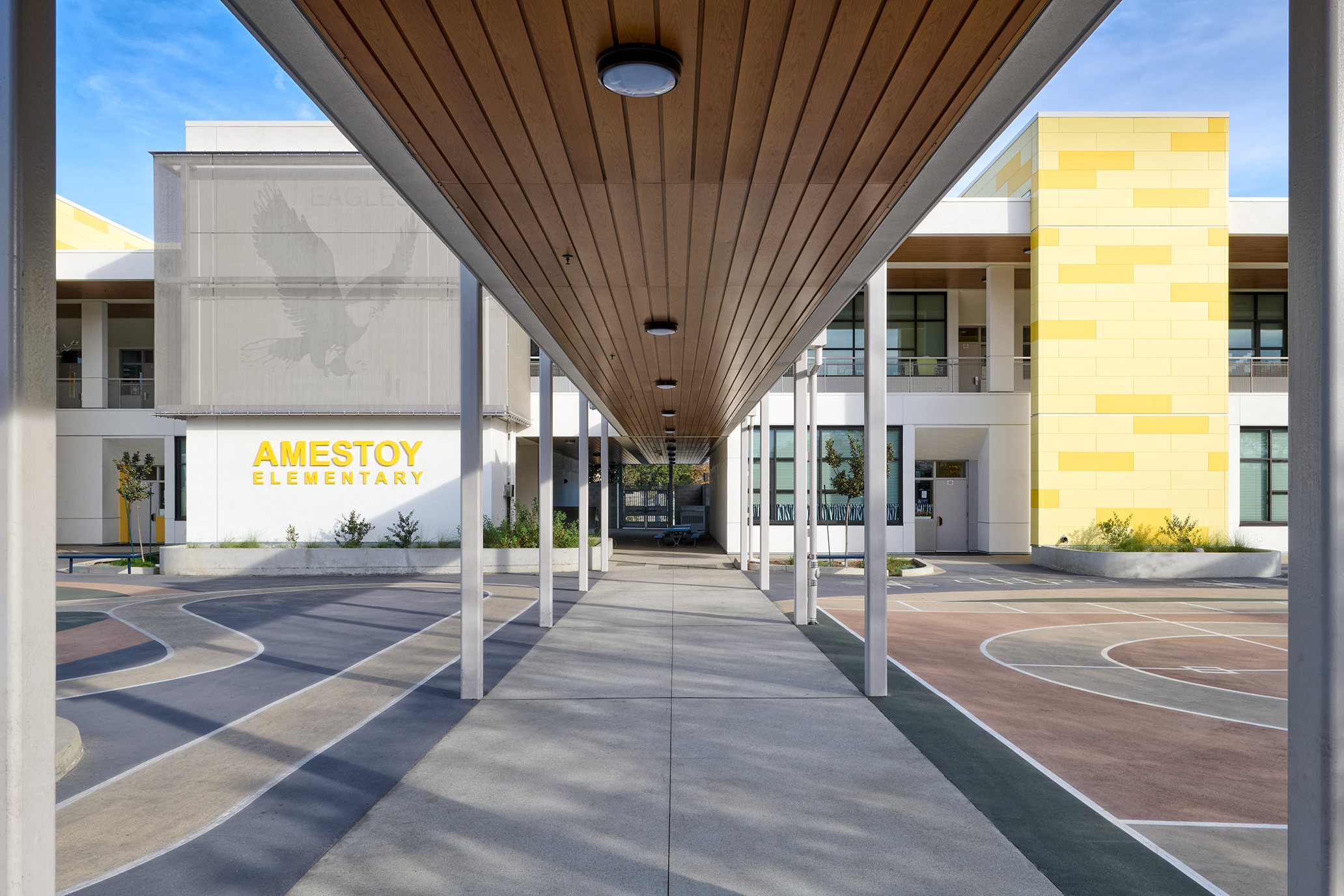 The new classroom building houses six kindergarten classrooms, six general classrooms, a teacher workroom, meeting space, restrooms, and outdoor learning environments. The project also consisted of removing 12 existing portable classrooms to replace them with permanent new construction.